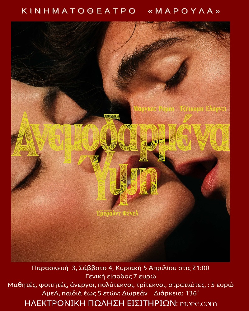 Η ταινία “Ανεμοδαρμένα Ύψη”, εμπνευσμένη από τη μεγαλύτερη ιστορία αγάπης όλων των εποχών, με φόντο το επιβλητικό τοπίο του Γιορκσάιρ, προβάλλεται στο Μαρούλα από τις 3 έως τις 5 Απριλίου. Το έργο βασίζεται στην ομώνυμη θρυλική νουβέλα της Έμιλι Μπροντέ, προσαρμοσμένη σεναριακά από τον Emerald Fennel.