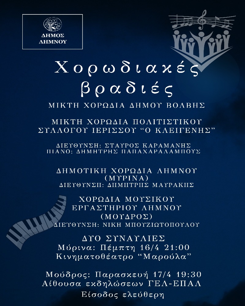 Δύο ξεχωριστές χορωδιακές συναυλίες φιλοξενούνται στη Λήμνο, στη Μύρινα και το Μούδρο την Πέμπτη16 και την Παρασκευή 17 Απριλίου, φέρνοντας κοντά χορωδίες από διαφορετικές περιοχές της Ελλάδας σε ένα ζωντανό μουσικό αντάμωμα γεμάτο αρμονία, συνεργασία και κοινή έκφραση.