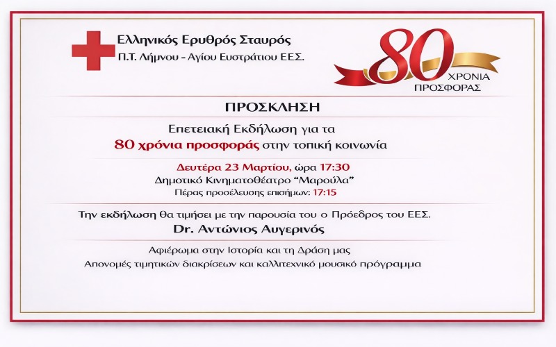 Το Περιφερειακό Τμήμα Ε.Ε.Σ, Λήμνου-Αγίου Ευστρατίου, την Δευτέρα, 23 Μαρτίου 2026, και ώρα 17:15, διοργανώνει Επετειακή Εκδήλωση για τα 80 χρόνια προσφοράς στην τοπική κοινωνία, η οποία θα γίνει στο Δημοτικό Κινηματοθέατρο “Μαρούλα” στη Μύρινα Λήμνου.