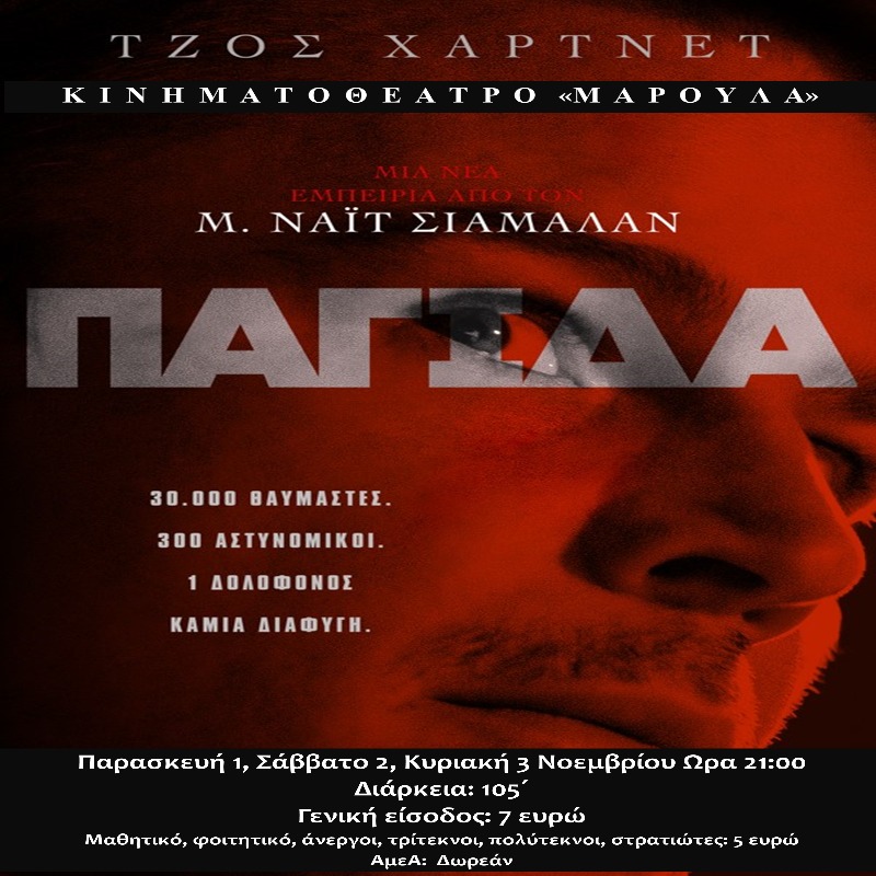 Το αγωνιώδες θρίλερ του σκηνοθέτη της “Έκτης Αίσθησης”, “Παγίδα”, προβάλλεται στο “Μαρούλα” σήμερα Παρασκευήυ 1 Νοεμβρίου, το Σάββατο 2 και την Κυριακή 3 Νοεμβρίου.
